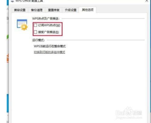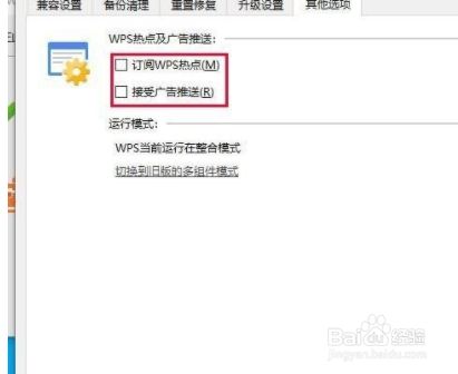 4、在WPSOFFICE配置工具界面中,我們點(diǎn)擊“其他選項(xiàng)”選項(xiàng)卡,就可以看到WPS熱點(diǎn)及廣告推送,我們將“訂閱WPS熱點(diǎn)”和“接受廣告推送”兩個選項(xiàng)的勾選去除,并確定即可。