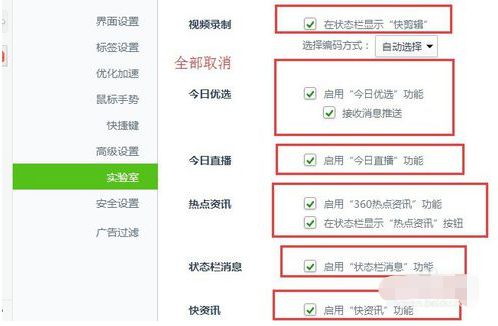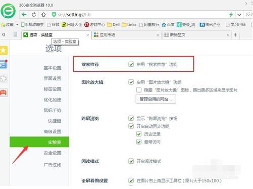 1、通過瀏覽器選項(xiàng)設(shè)置,設(shè)置其中的:實(shí)驗(yàn)室,將不需要的推薦都取消勾選,如圖所示:
