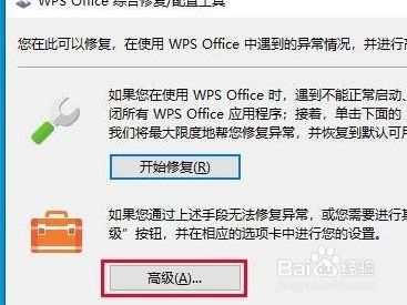 3、打開WPSOffice綜合修復(fù)和配置工具后,打開之后,我們點(diǎn)擊“高級”按鈕,如下圖所示。