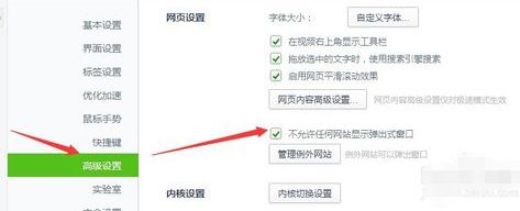 2、通過“高級設(shè)置”勾選:不允許任何彈窗