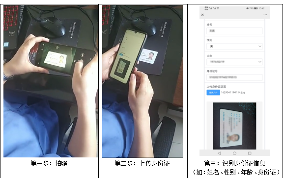 手機只需輕輕的“咔嚓”一聲,拍照身份證入系統(tǒng)時自動識別身份證信息。操作簡單如下圖: