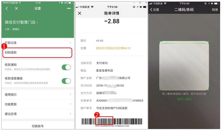 顧客出示訂單條碼-商家掃碼退款-商家進入掃碼退款,掃描顧客商戶單號條碼,確認退款訂單信息后,完成退款