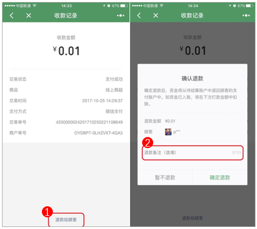 商家在收款記錄-打開退款訂單詳情-退款給顧客。退款時可添加退款備注,備注信息會在收款詳情中展示。