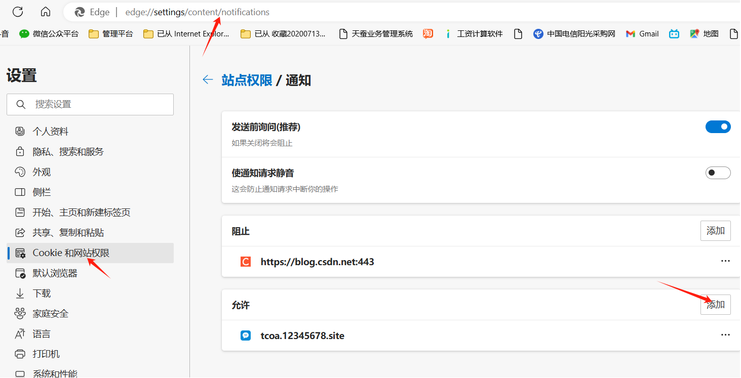 第一步:在地址欄輸入edge://settings/content/notifications,然后點(diǎn)”Cookie和網(wǎng)站權(quán)限/通知/允許/添加網(wǎng)址”,如下圖