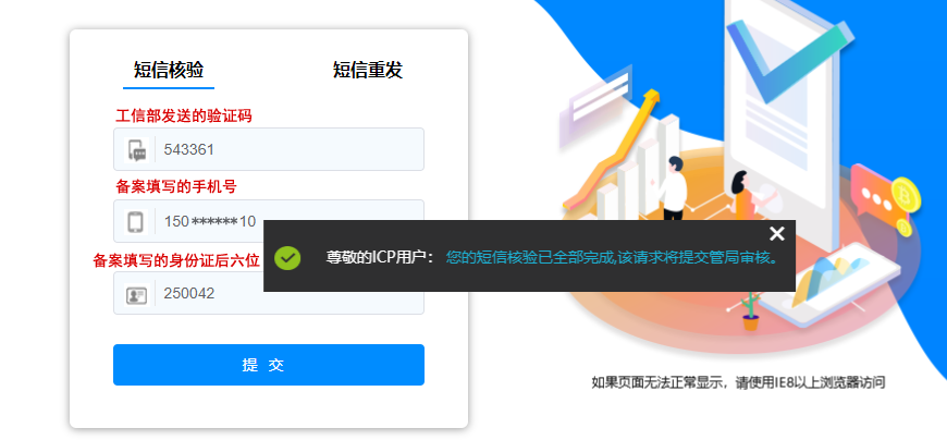 根據(jù)工信部最新要求,自2020年8月17日起,各省市進(jìn)行備案申請(qǐng)時(shí)需通過工信部備案管理系統(tǒng)進(jìn)行短信核驗(yàn),需進(jìn)行短信核驗(yàn)的備案類型請(qǐng)參見需要短信核驗(yàn)的備案類型。