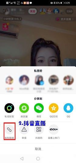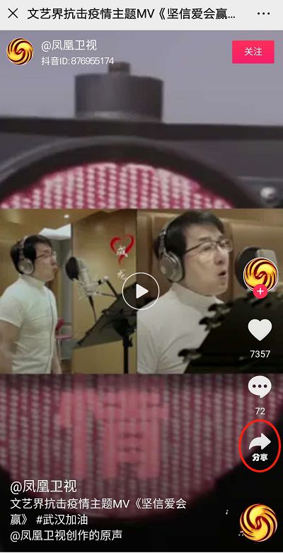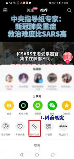 抖音視頻頁:從抖音APP中復(fù)制鏈接,如下圖紅色方框1點擊右上方三個點后點復(fù)制鏈接即可。