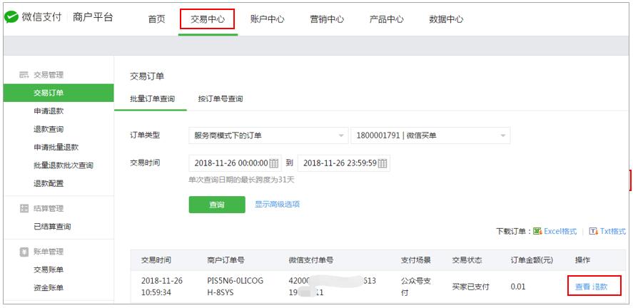 1)查詢交易訂單發(fā)起退款: