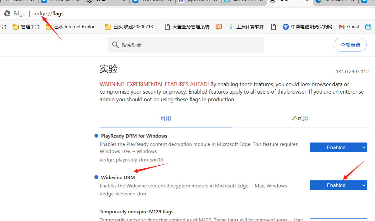 第二步:在地址欄輸入edge://flags/,然后搜索Widevine DRM,選擇“Enabled”,重啟瀏覽器.